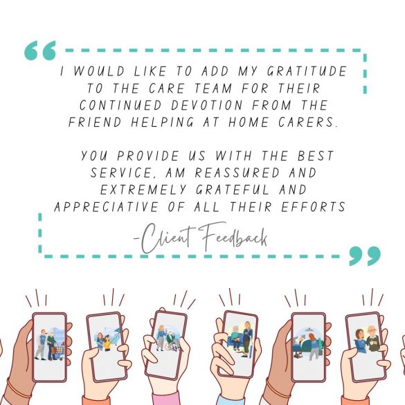 “I would like to add my gratitude to the care team for their continued devotion from the Friends Helping at Home Carers. You provide us with the best service. I am reassured and extremely grateful and appreciative of all their efforts.”